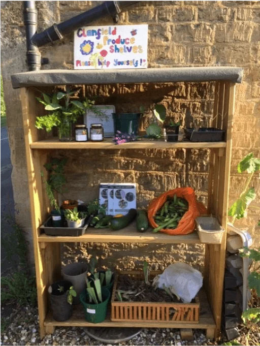 One Planet Clanfield set to work establishing a Community Allotment, with support from CAG Network, and they now hold regular talks and composting sessions that involve the whole community. They also received a grant from a local charity shop for shed and gardening tools. The Community Allotment has been so successful that a set of ‘Sharing Shelves’ have been created, where surplus seasonal produce is placed for anyone to share and use. All items on the shelves are free.